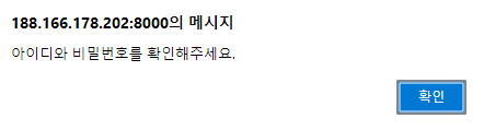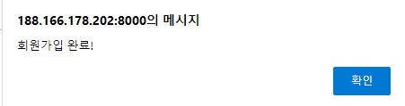 - 정상적으로 입력 후 가입버튼을 누르면 아래와 같이 메시지가 뜬다.
