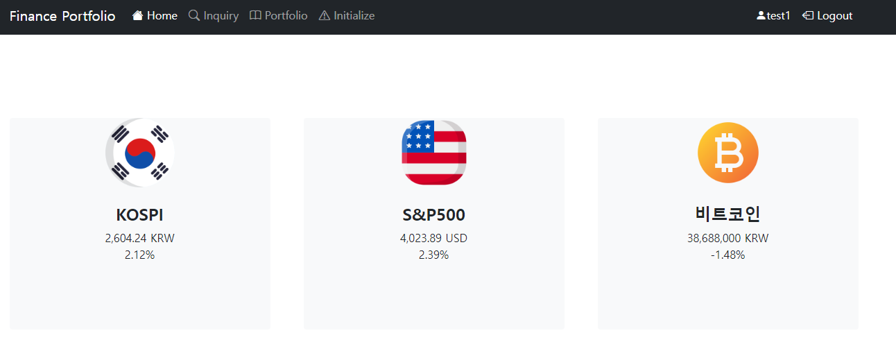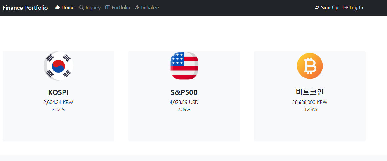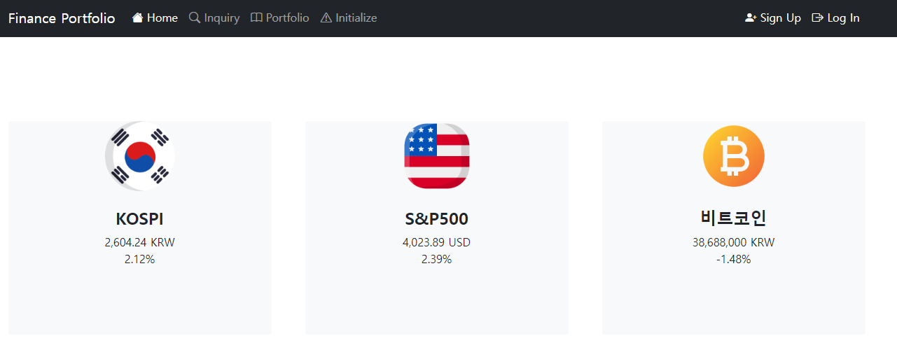 - 우선 처음 home 페이지는 이렇다. (3개의 지수들은 아직 과거의 데이터들이다.)