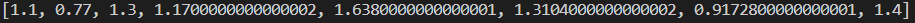 N개의 실수가 있을 때, 한 개 이상의 연속된 수들의 곱이 최대가 되는 부분을 찾아, 그 곱을 출력하는 프로그램을 작성하시오. 예를 들어 아래와 같이 8개의 양의 실수가 주어진다면,