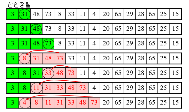 즉 이미 정렬된 리스트에 원소를 계속해 삽입하며 정렬하는 방식이다.