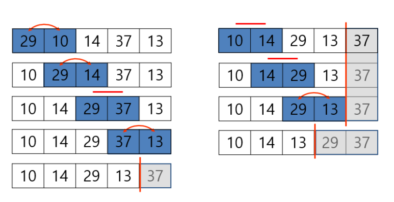 정렬된 맨 오른쪽 부분은 제외한 상태로 반복하여 최종적으로 리스트를 오름차순 정렬하는 방법이다.