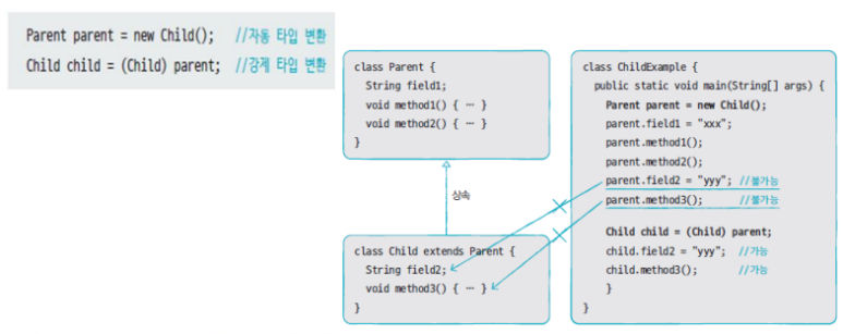 부모 타입으로 자동 타입 변환 이후에는 부모 클래스에 선언된 필드 및 메소드만 접근 가능하다.