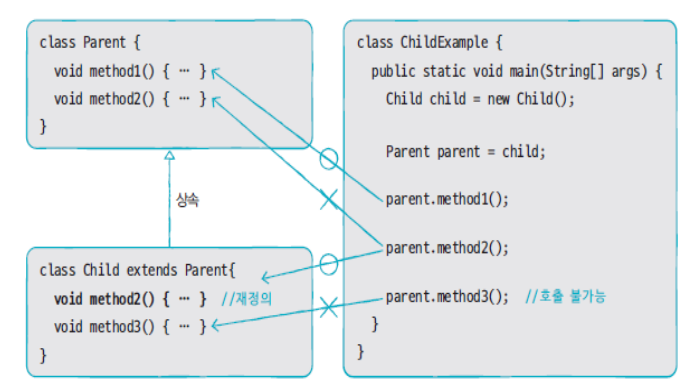 부모 타입일 때는 자식 객체의 메소드와 필드에 접근이 불가하지만,